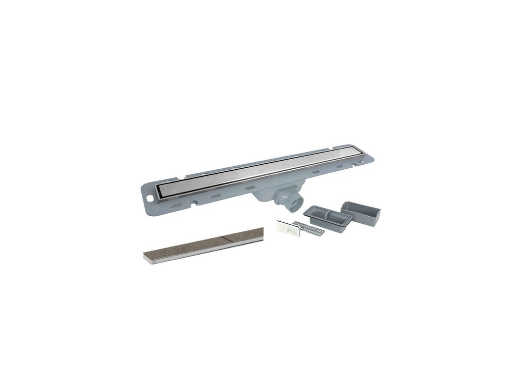 Odtokový žlab je dodáván včetně roštu. Jeho design je jednoduchý a esteticky příjemný. Kombinace sifonu a suché uzávěry zabraňuje pronikání zápachu, v případě vyschnutí sifonu. Možnost otočení roštu a použití pro vložení dlažby.