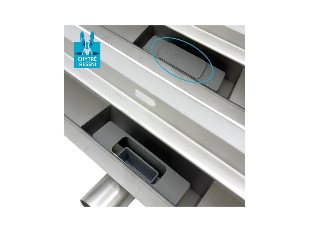 Odtokový žlab je dodáván včetně roštu TILE. Rošt je možné použít jako variantu, kdy je vidět jednolitá nerezová plocha, nebo je možné do roštu nalepit přímo dlažbu. Obě varianty působí velmi jednoduše a čistě, přičemž druhá varianta udělá ze žlabu nenápadný doplněk sprchového koutu, který skvěle splyne s ostatní dlažbou.
