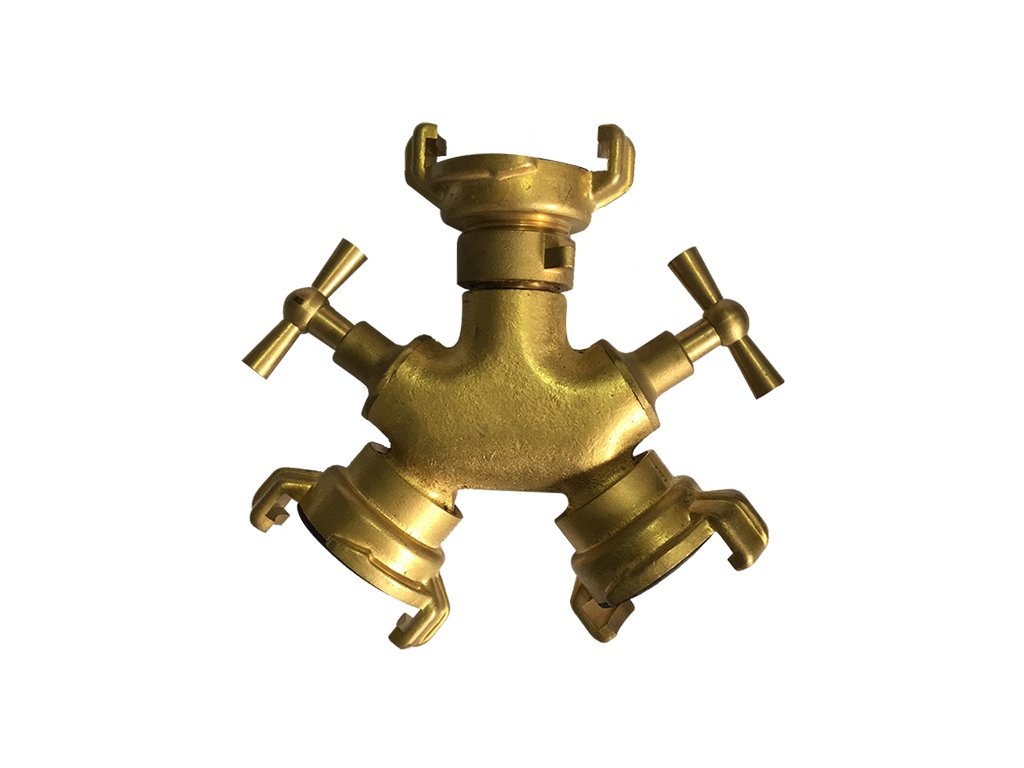 Bajonetový třícestný uzavíratelný rozbočovač. Uzavírání pomocí mosazných vřetýnkových vršků.