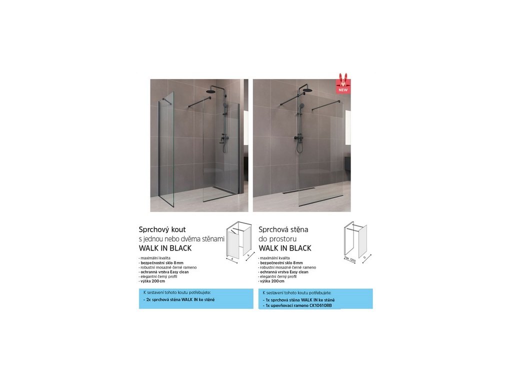 1x Sprchovou stěnu Walk In (balení obsahuje sklo, boční profil, spodní lištu a 1x upevňovací rameno)