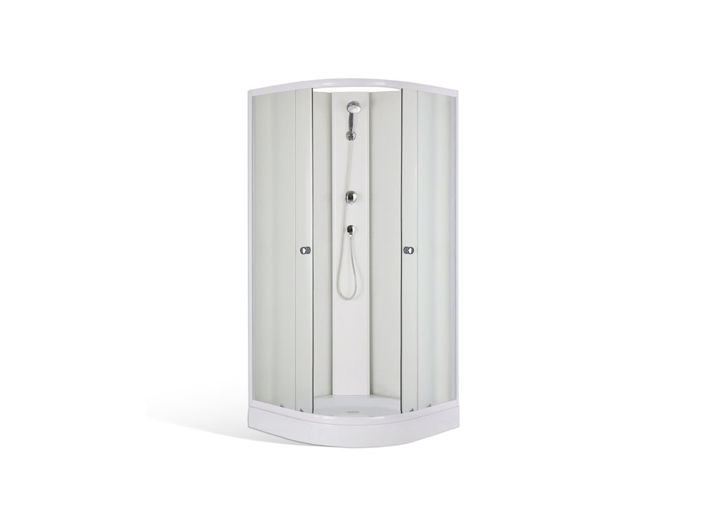 Klasický čtvrtkruhový sprchový box s posuvnými dveřmi se vyznačuje jednoduchým designem, vysokou kvalitou zpracování. Profily jsou v bílé barvě, prosklení z 4 mm bezpečnostního matného skla, zadní sklo super bílé neprůhledné, šířka vstupu 55 cm. Vanička je z akrylátu v bílé barvě.